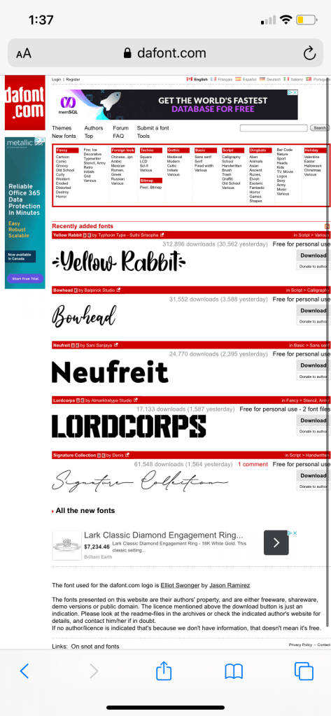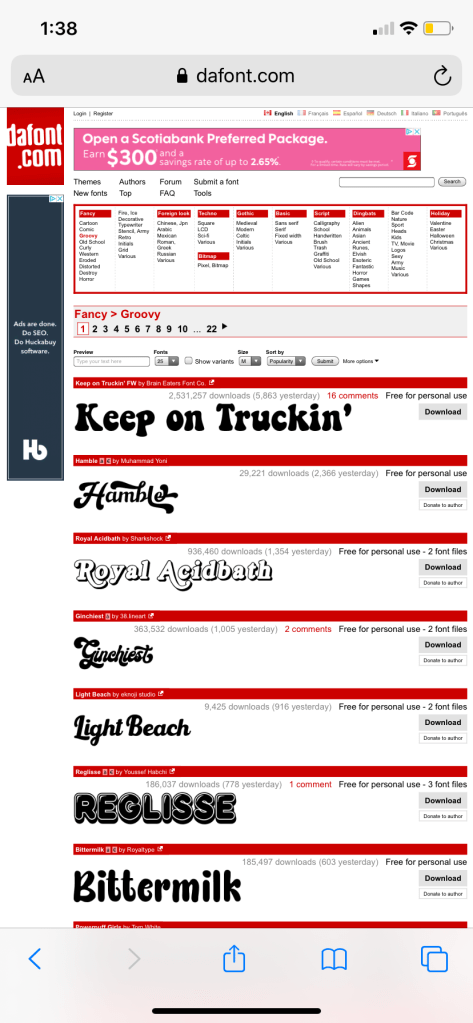 On your phone, open the safari app and visit Dafont.com (or if you’re reading this on mobile, click here)! The first page you’ll see features fonts that have been recently uploaded to Dafont (left photo). Above where the list of fonts begins there’s a massive menu that includes categories, so it’s easier for you to browse through potential options that are the vibe you’re looking for. As seen in the right photo, one of my personal favourites is “Groovy” – the best page to find vintage, 70s inspired fonts.