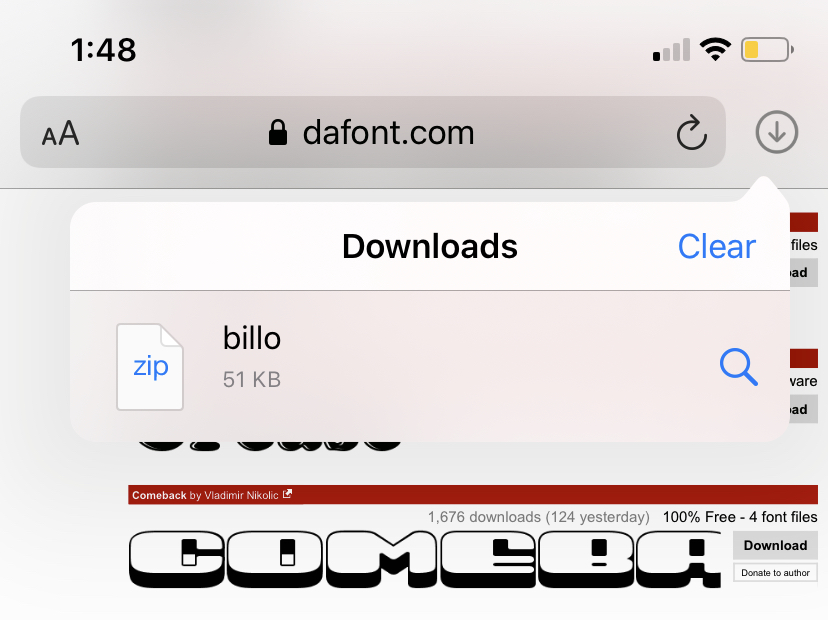 Once you’ve found a font that you love, click the “Download” button to the right of each option. Be mindful of the caption above it – if it says “Free for personal use”, you’re more than welcome to use it for personal reasons (such as Instagram stories or TikToks)! After you click download, select the small downwards facing arrow in the upper right corner of your Safari browser. The name of your font should appear and once it does, select it!