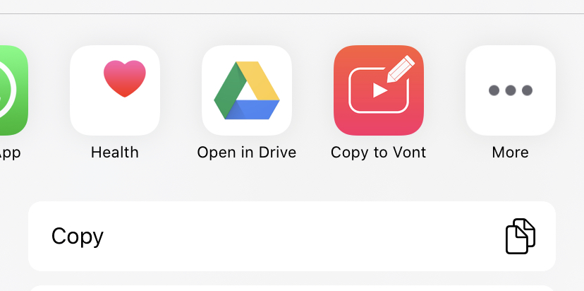 Your phone will automatically redirect you to the files app. From there press and hold on your downloaded font, select “share”, and then swipe right until you see “Copy to Vont” as an option (if you don’t see it, click on the “…” and it should appear). Afterwards click on “Install”, and then you’re all set to use your new font in the “Your Fonts” tab on Vont!